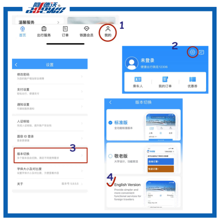 Stiahnite si aplikáciu 12306, prejdite na „Ja (v spodnej časti) → „Nastavenia“ → „Prepnúť verziu“ → vyberte angličtinu a prepnite na anglickú verziu.