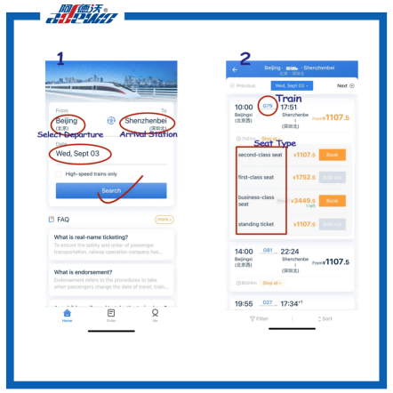 Klepnite na „Vlakové lístky“-> Zadajte mesto odchodu, cieľ a dátum cesty, vyberte typ vlaku a sedadla, Klepnutím vyplňte informácie o cestujúcich,Dokončite platbu a potvrďte objednávku.