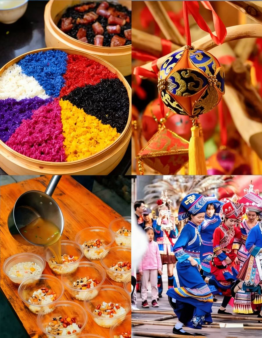Okrem spevu ľudia oslavujú prípravou päťfarebnej lepkavej ryže farbenej rastlinnými šťavami, hádzaním vyšívaných loptičiek, tancom pri bambusových tyčiach a hraním na bronzové bubny.